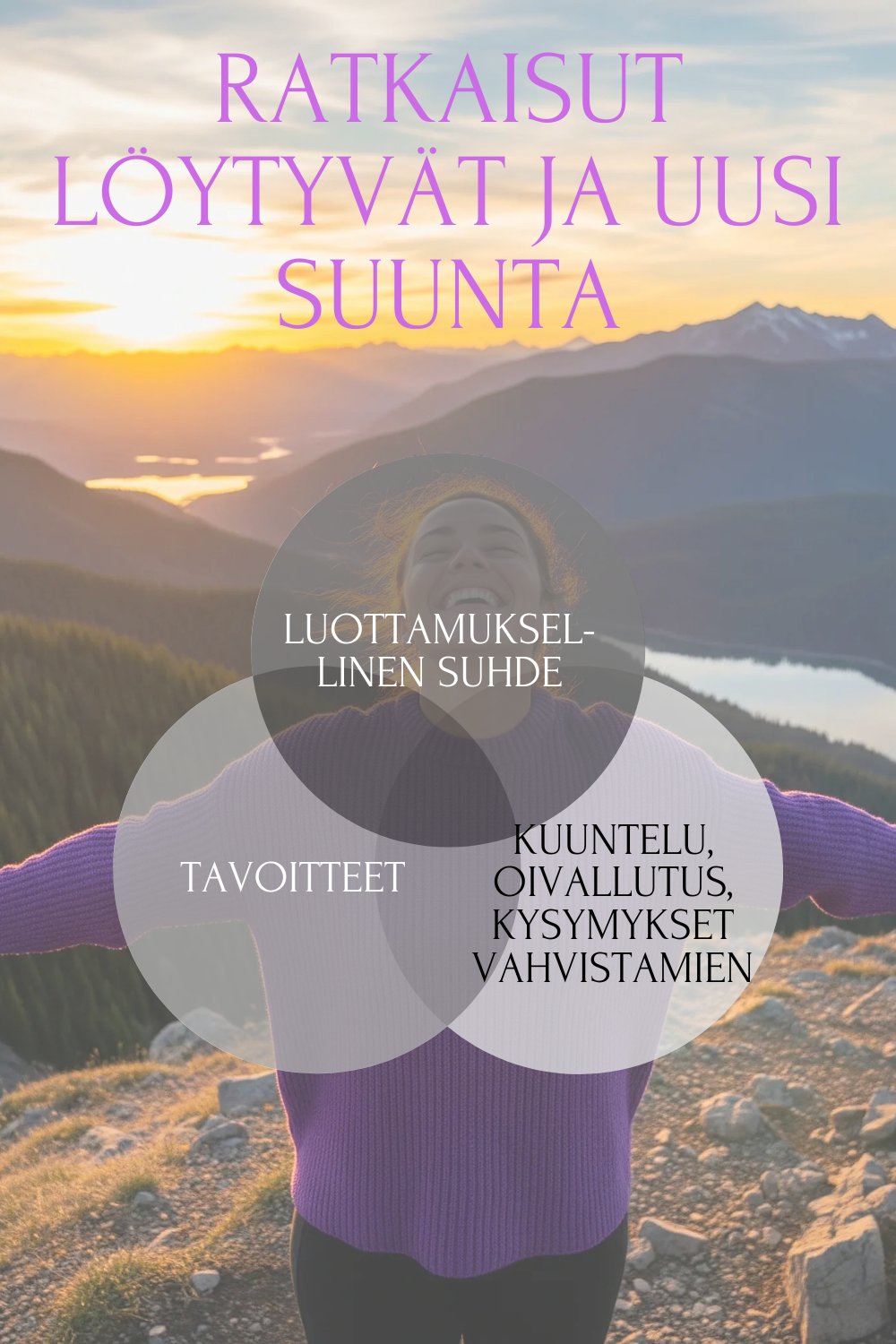 Työskentelen sensitiivisesti ja turvallisesti, kuitenkaan menemättä terapian alueelle. Fokus on voimavaroissa, selkeydessä ja eteenpäin liikkumisessa.